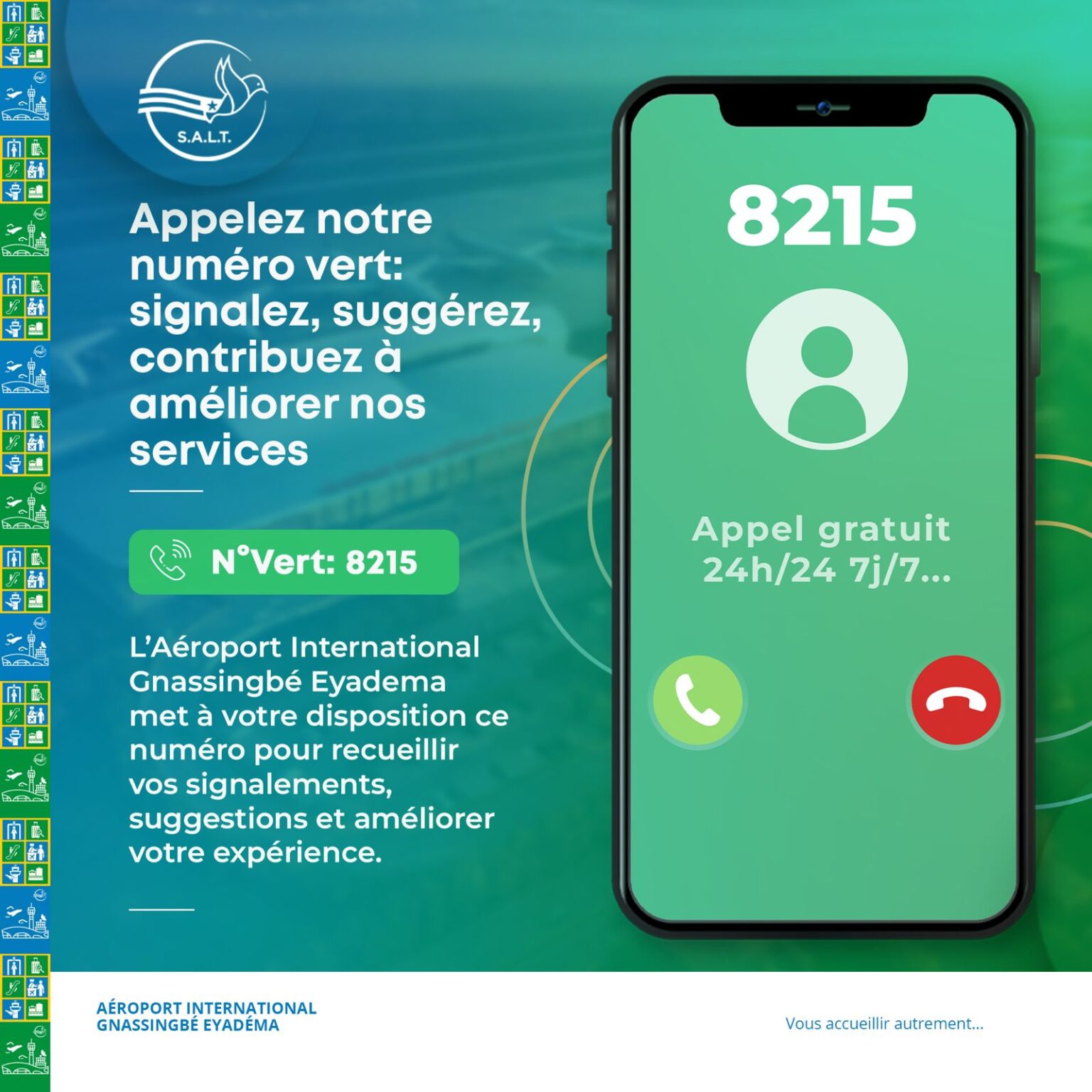 L’Aéroport international Gnassingbé Eyadema (AIGE) renforce son dispositif d’écoute envers les voyageurs. Depuis le mardi 28 avril 2026, le numéro vert 8215 est officiellement opérationnel. Cette mesure s’inscrit dans une volonté constante de mieux servir les usagers de la plateforme aéroportuaire de Lomé.