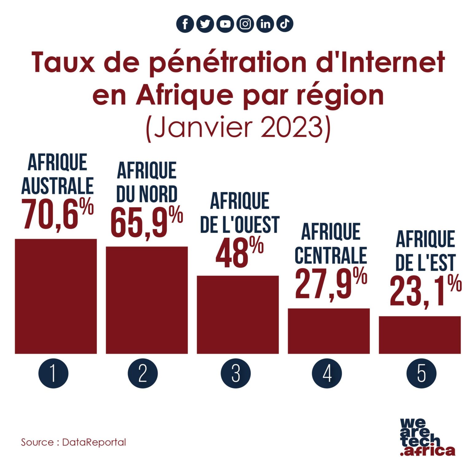 C’est du moins ce que révèle une étude publiée par l’agence de presse Ecofin. L’étude qui montre les taux de pénétration d’Internet par région en 2022, place l’Afrique australe largement en tête avec 70,6%, l’Afrique du nord suit 65,9%,vient l’Afrique de l’ouest avec 48%, l’Afrique centrale avec. 27,9% et l’Afrique de l’Est boucle avec 23,1%. Ces taux de pénétration d’internet ont été révélés en janvier 2023.