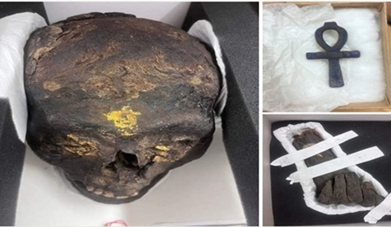 L’Égypte a annoncé avoir récupéré trois pièces antiques en provenance de l’Allemagne, comprenant un crâne et une main de momie plaquées or, ainsi qu’une amulette en forme de symbole Ankh.