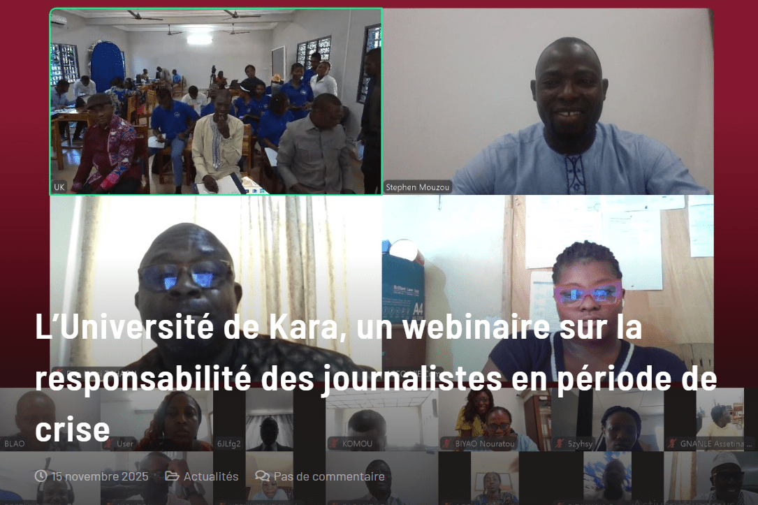 L’Université de Kara (UK) a organisé, le vendredi 14 novembre, un webinaire portant sur le rôle des médias en période de crise. Soutenue par l’Observatoire togolais des médias (OTM), cette rencontre virtuelle avait pour thème : « Les médias en période de crise : enjeux sociétaux et responsabilités journalistiques ».