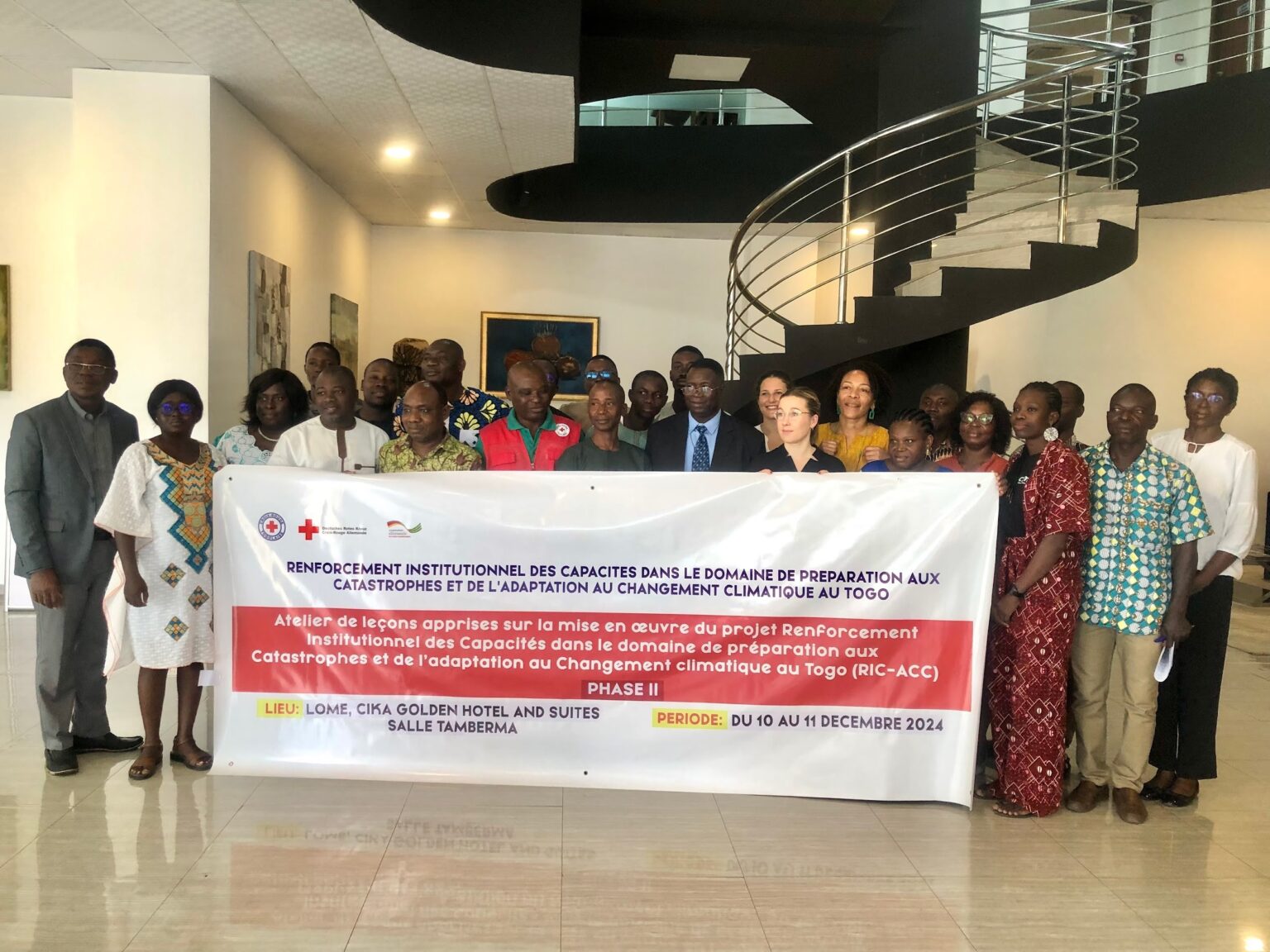 La Croix-Rouge allemande, en collaboration avec la Croix-Rouge togolaise, a organisé un atelier autour des leçons apprises de la phase II du projet de Réduction des Risques de Catastrophes et d’Adaptation au Changement Climatique (RIC-ACC). Débuté ce 10 décembre 2024, l’atelier prend fin le 11 décembre 2024.