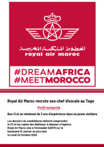 La compagnie Royal Air Maroc (RAM), un géant du secteur aérien en Afrique, s’apprête à consolider sa présence en République togolaise avec le recrutement de son nouveau Chef d’Escale à Lomé. Ce poste reste l’un des plus stratégiques pour garantir l’excellence du service et l’efficacité logistique dans le secteur. Pour plus d’informations sur le recrutement cliquez ici