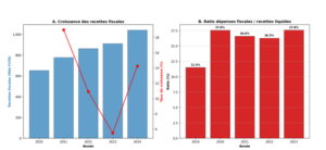 L’analyse rétrospective de la période 2020-2025 (Graphique 8) révèle un double mouvement : une dynamisation remarquable de la mobilisation des recettes fiscales d’une part, et une croissance encore plus rapide des dépenses fiscales d’autre part. Le graphique 9 synthétise ces tendances. La persistance d’un ratio dépenses fiscales/recettes liquides autour de 16-18 % pose la question de l’arbitrage entre deux objectifs potentiellement contradictoires : maximiser les recettes immédiates ou stimuler l’investissement privé par des incitations fiscales. La littérature sur les dépenses fiscales suggère que leur efficacité est contingente à la qualité de leur ciblage et à l’existence de mécanismes d’évaluation d’impact (Tanzi & Zee, 2000). Les recommandations du Comité National d’Évaluation des Dépenses Fiscales (CONEDEF) vont dans ce sens, préconisant notamment l’évaluation systématique de l’impact socio-économique des mesures dérogatoires.
