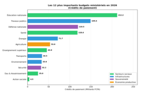 L’analyse des allocations budgétaires par ministère révèle les priorités de la politique gouvernementale et permet d’identifier les choix stratégiques en matière de développement. Le Graphique 10 présente les douze plus importants budgets ministériels pour l’exercice 2026, classés par ordre décroissant des crédits de paiement et catégorisés par domaine fonctionnel.