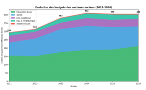Le Graphique 10 illustre la progression des budgets sociaux sur la période 2021-2026. L’enveloppe globale est passée de 295 milliards à 406 milliards, soit une augmentation de 38 % en cinq ans. L’éducation nationale reste le poste dominant, avec une progression de 154,9 à 212,2 milliards (+37 %) (Tableau 3). Cette priorité accordée à l’éducation primaire et secondaire traduit une stratégie d’universalisation de l’accès à l’éducation de base, condition préalable au développement d’un capital humain de qualité.