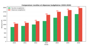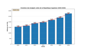 En pratique, le budget de l’État togolais a connu une progression remarquable sur la période 2020-2026, passant de 1 562,5 milliards de FCFA en 2020 à 2 751,5 milliards projetés pour 2026, soit un taux de croissance annuel moyen (TCAM) de 9,9 %. Un quasi-doublement en six ans : le chiffre interpelle.