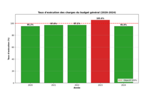 Dans cette perspective, l’exécution budgétaire (Graphique 3) constitue un premier indicateur, certes imparfait mais révélateur, de la capacité de l’État à transformer les intentions en réalisations. Sur la période 2020-2024, le taux d’exécution des charges du budget général a oscillé entre 95 % et 106 %, révélant une capacité d’absorption globalement satisfaisante. L’année 2023 se distingue par un dépassement de 106 %, lié aux urgences sécuritaires et aux mesures anti-vie chère.