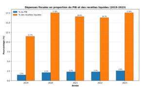Graphique 7 : Dépenses fiscales en proportion du PIB et des recettes liquides (2019-2023)